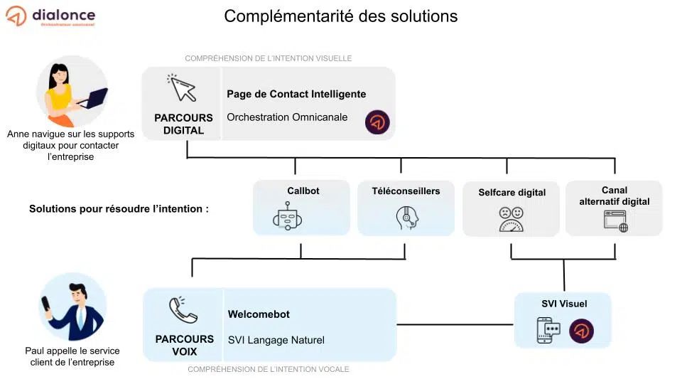 Complementary to this voice journey, if we go back to the step preceding the call, it's also possible to propose a visual solution, on the contact page, where the customer service phone number is usually found. Instead of directly presenting the phone number and other contact solutions without having qualified the intention, the idea is to offer a digital journey that immediately refines the understanding of the contact reason (via questions or conversational interaction). This way, the customer's need can be directly oriented based on the added value of the reason and the company's processing capacity: for low-added-value reasons, towards self-care, a form, or a voicebot, and for high-value calls, towards human interaction via chat or a phone exchange with an advisor. This is referred to as omnichannel orchestration.